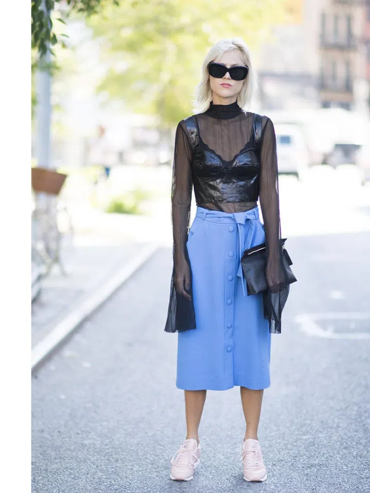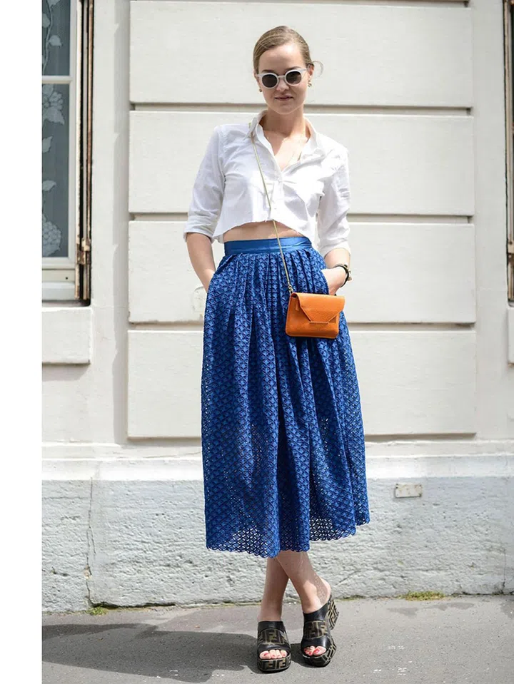 You can repurpose your work blouse for the weekend. Simply pair it with a midi skirt, a pair of flatforms (or platforms) and a tiny crossbody bag. Add statement accessories to elevate your look.