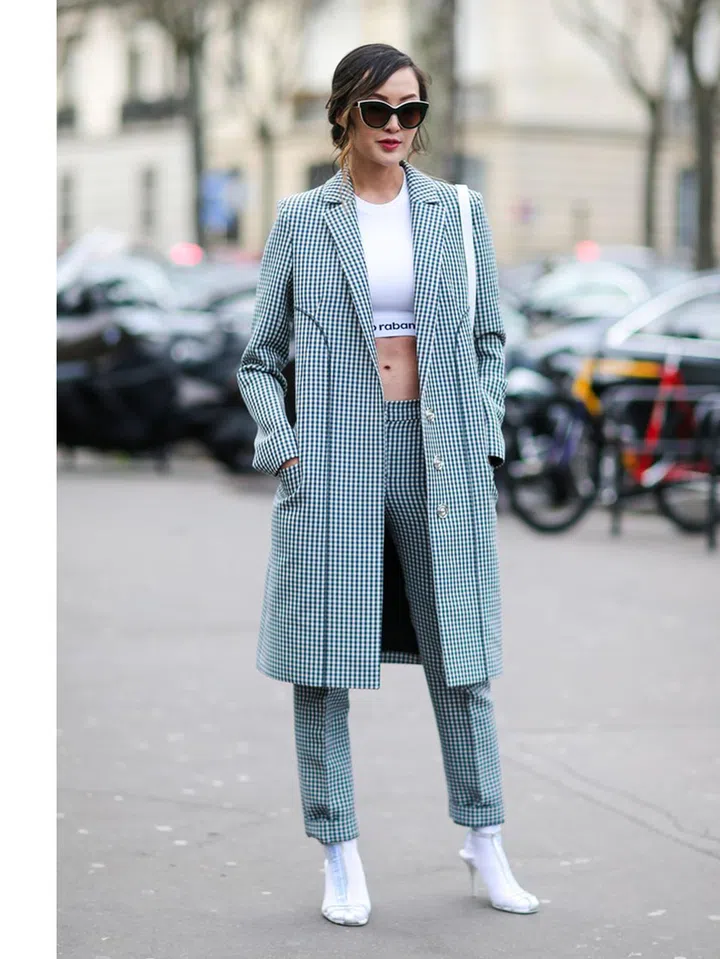 If a full suit is too severe for your liking, consider breaking up the look by showing off some skin underneath with a cropped top. Just look at YouTuber Chriselle Lim.