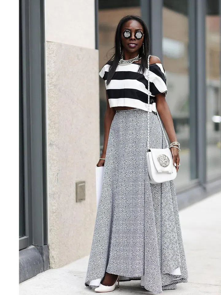 Crop tops and maxi skirts go together like peanut butter and jelly. The combination gives the illusion of a longer torso, since the skirt sits high on the hips. And if you want to take this daytime look up a notch, simply add heels.