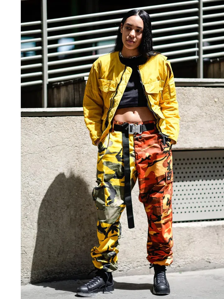 Don’t let busy prints and bright colors overwhelm your frame. Break up the look by revealing a hint of skin via a black cropped tee. This is also the perfect scenario in which to show off those toned abs, courtesy of SoulCycle.