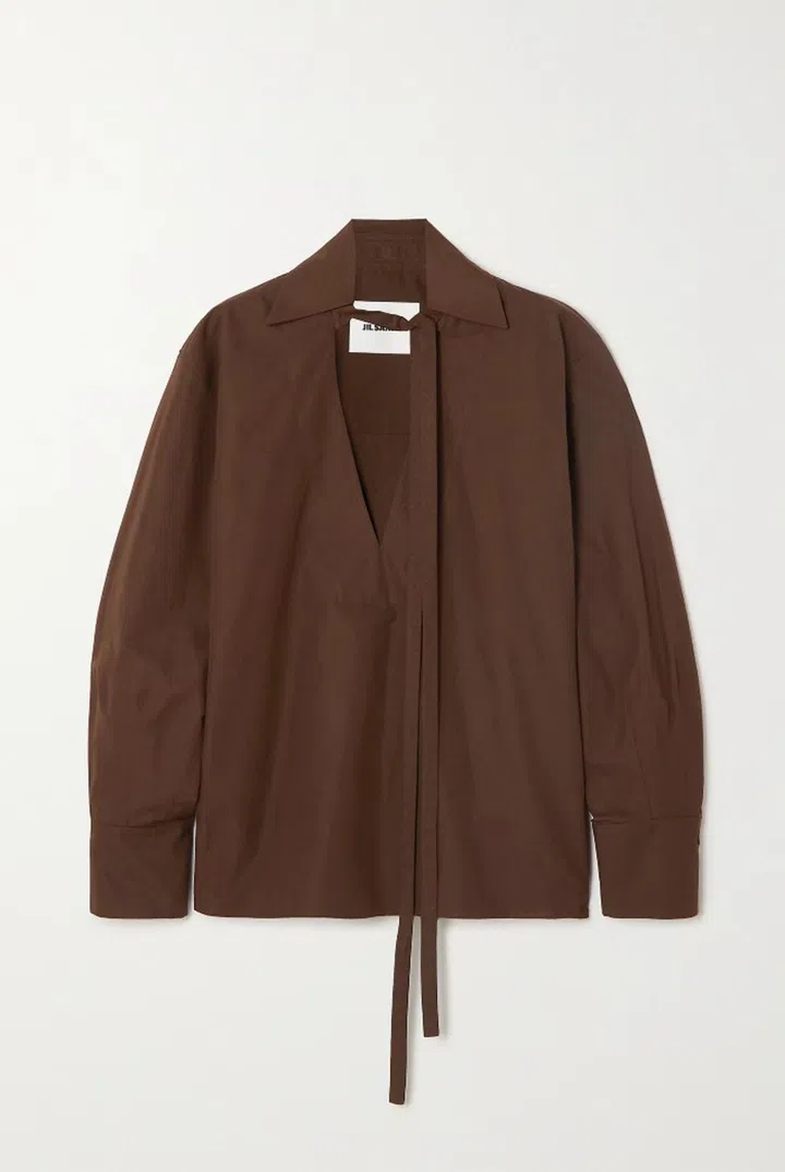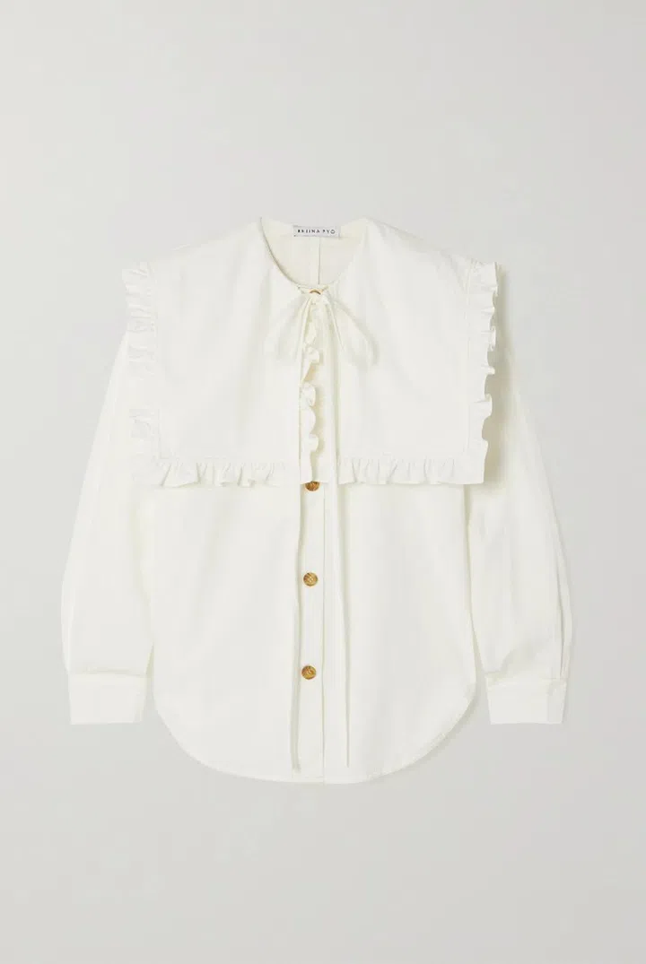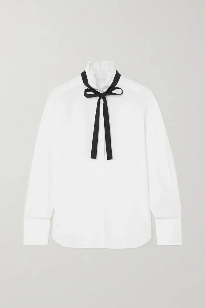 You can’t go wrong with a classic white shirt. This one comes with a romantic collar and silk ties.