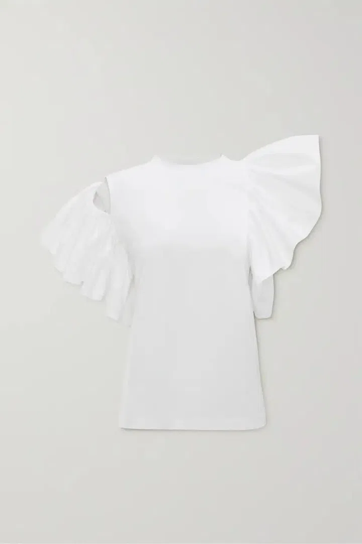 Asymmetric cotton-jersey and ruffled taffeta T-shirt, $1,018, Alexander McQueen