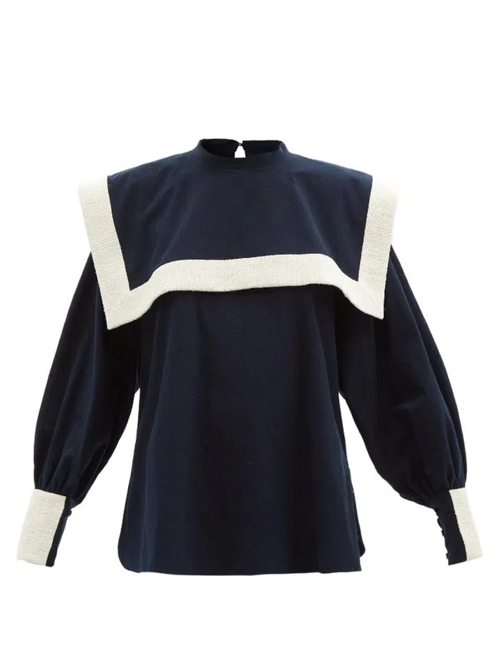 Featuring an oversized ruffled sailor collar and bow, this sweet top made from organic cotton-poplin can be dressed up or down.