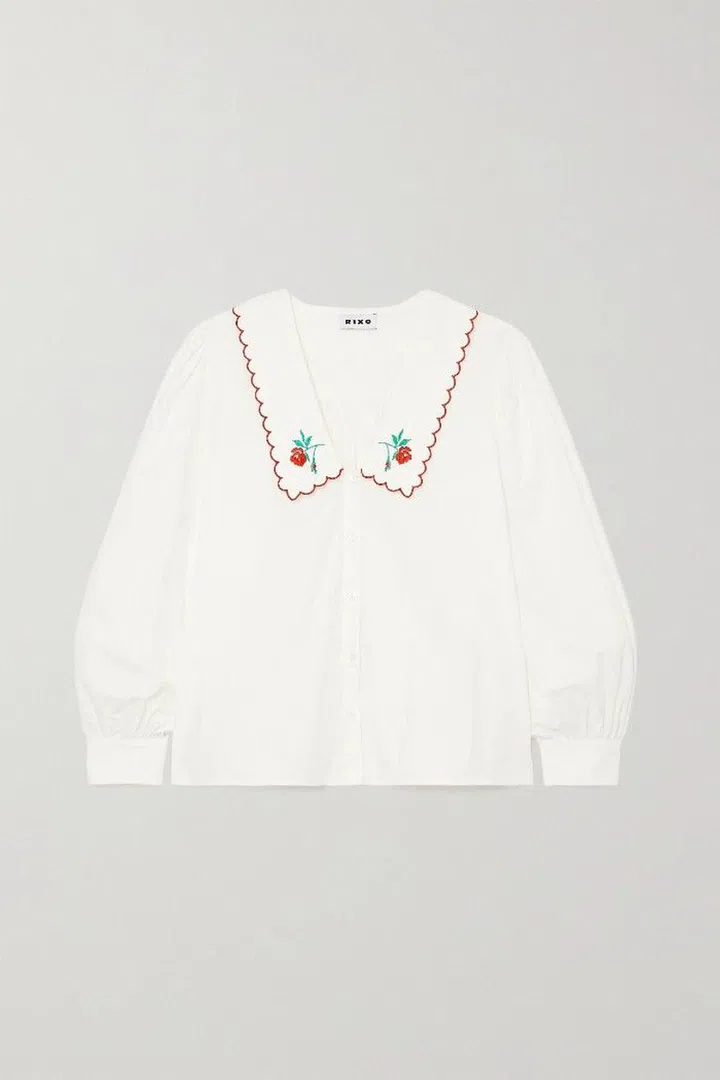A vintage-inspired option that features a scalloped collar embroidered with roses and matching red piping. Throw it on with jeans and you’ve got yourself a cute outfit.