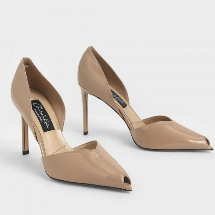 Echo the retro charm of the 1950s with D’Orsay pumps rendered in glossy patent leather, featuring a striking blade heel.
