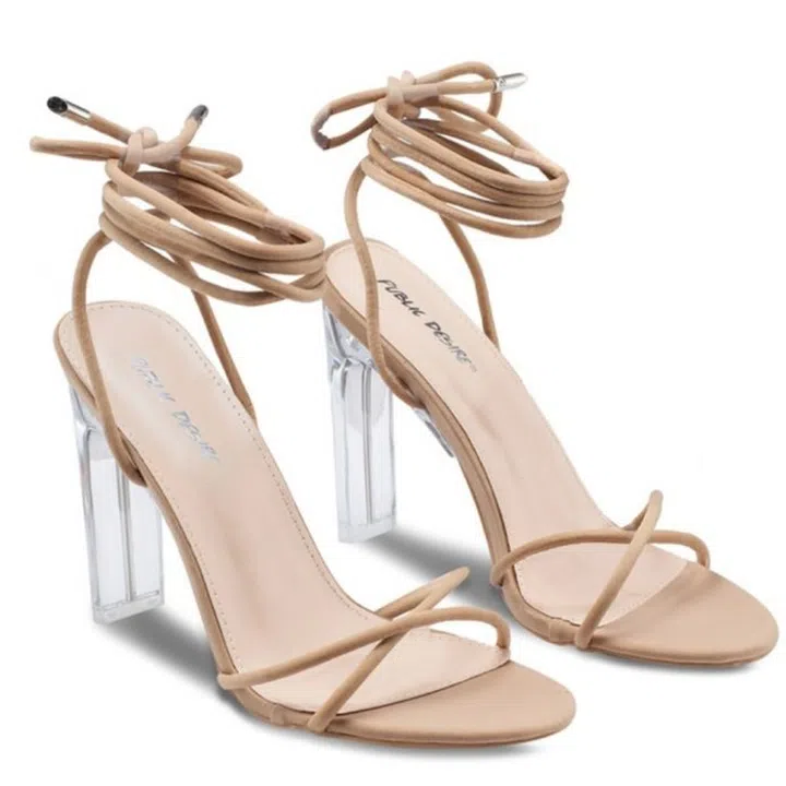What’s not to love about this strappy piece by Pubic Desire. Boasting a solid tone lace-up with transparent heels, this pair is perfect with a fuss-free gown featuring a thigh-high slit to show them off.