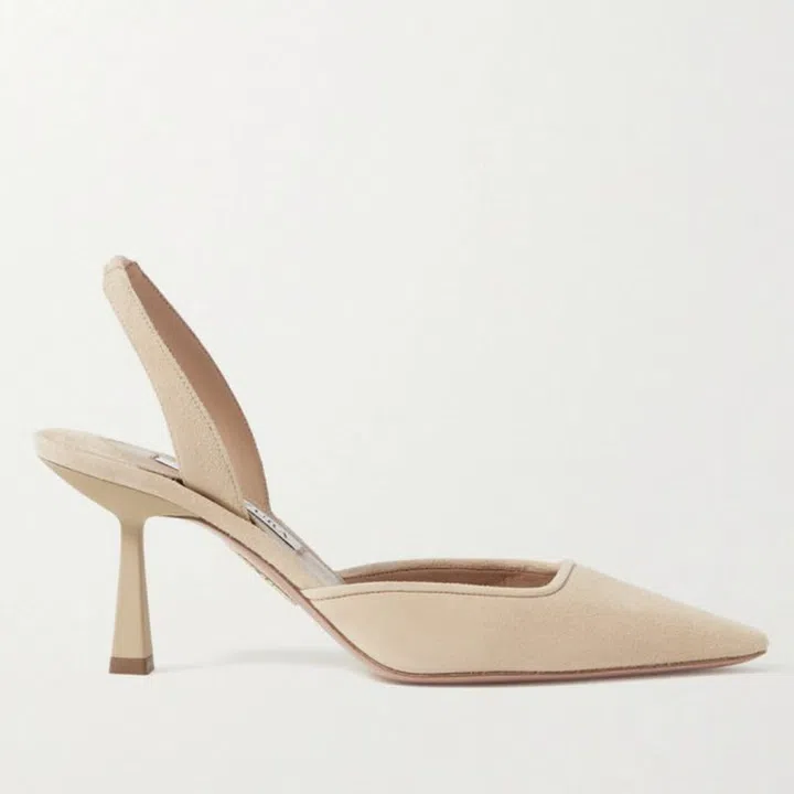 Handcrafted in Italy from beige suede, we especially love the elegant pointed toe and elastic slingback.