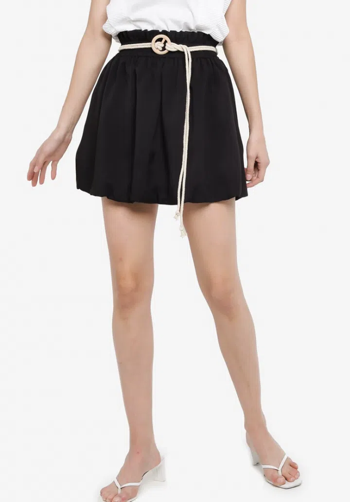 Need a cute black skirt to wear for Christmas or New Year (law-abiding) parties? This one gives the illusion of wider hips and a smaller waist due to its balloon-like structure. The white rope belt contrasts against the skirt, drawing attention to it. It comes with an elastic band and sits high on the waist, which is perfect for those of us who want some elongated legs.