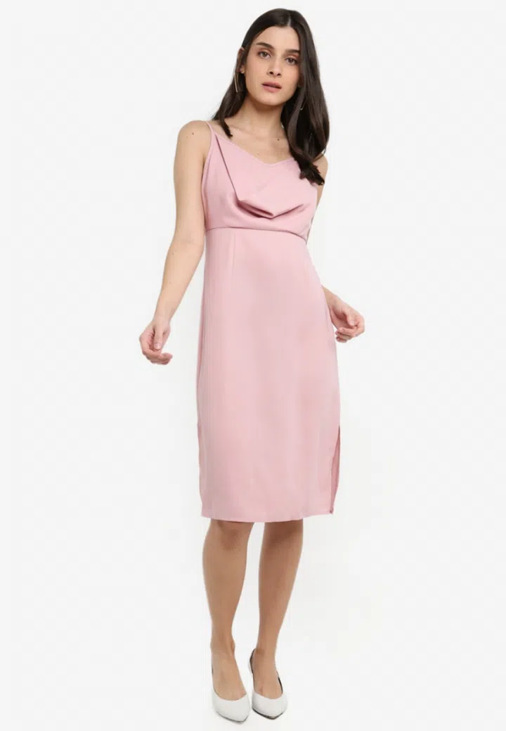 This unlined dress is made of polyester and comes with a v-neckline and beautiful cowl details. Adjust the dress to your liking with its adjustable straps. And don't worry about anything showing through the material - it's solid-coloured!
