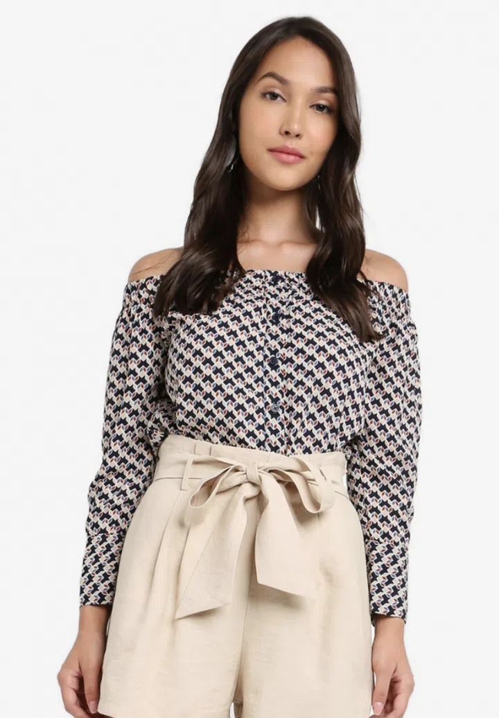 We love off-shoulder tops, and we know you do too. This one has a geometric pattern running throughout, which will look great paired with solid-coloured bottoms so that the outfit doesn't start looking too crazy. It has front-button fastening, which means that there's nothing stopping you from unbuttoning the first one and showing more skin if you want to (we don't judge, in fact, we are all for embracing your confidence! Do what makes you feel good.).