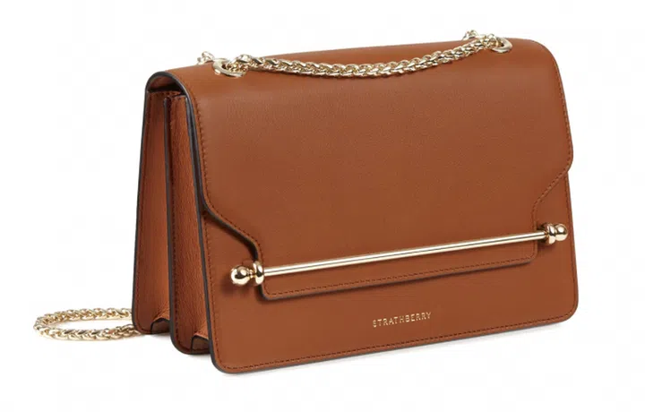 The Strathberry Nano Tote is another bag we have our eye on. With its iconic bar closure and a detachable chain shoulder strap, this carrier is made with the finest calf leather.