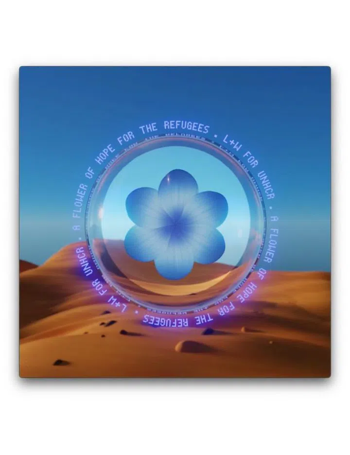 Secondly, One Flower of Hope for the Refugees for UNHCR (pictured). This is an edition of five NFTs by Lanzavecchia + Wai minted on the Ethereum blockchain, pledged towards UNHCR’s charity auction. It features a delicate blue flower which blooms in a desert against all odds, an analogue for precious hope in the face of adversity and is a dedication towards a refugee’s resilience and bravery. All proceeds from the charity auction will be donated to UNHCR in support of vulnerable displaced Afghans.