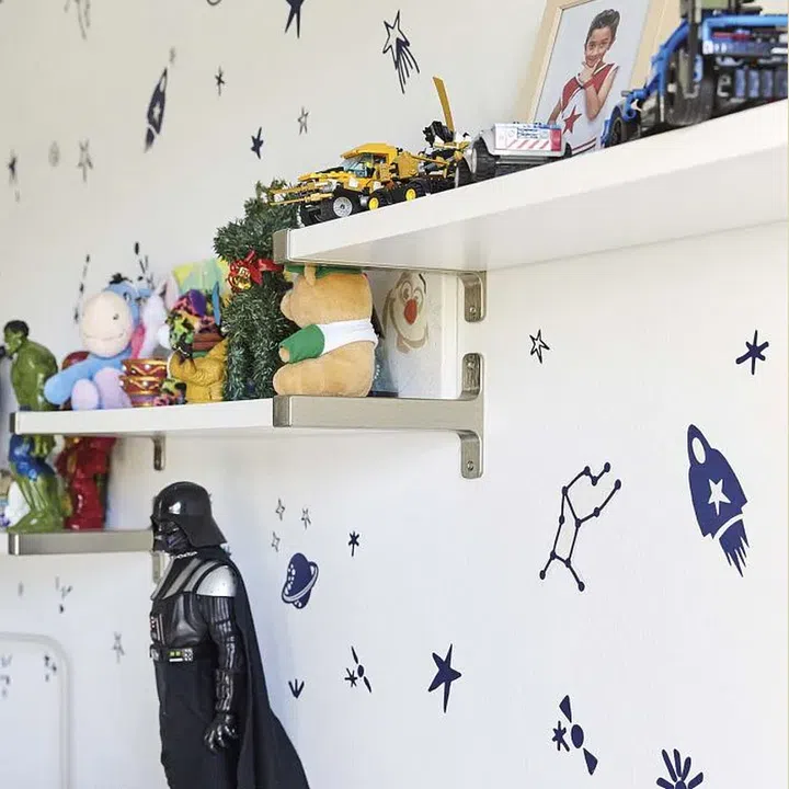The bedrooms flank the social spaces – one wing for the parents and the other for the boys and guests. The boys’ bedroom provides space for their current obsessions – shelves for action figures, blank wall for decals and illustrations – while still holding rooms for further development, allowing them to change the elements as their interest evolves.