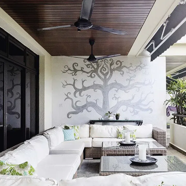 It opens up to the balcony, where a trickling fountain breathes freshness into the indoors.