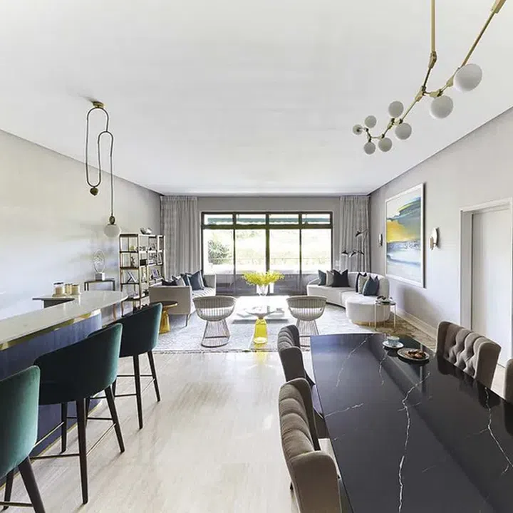 Anchoring the home is a seamless living-dining area. Positioned right after the foyer, the aforementioned bar is well stocked with whiskey and gin, all displayed on custom brass and floating glass shelves embedded