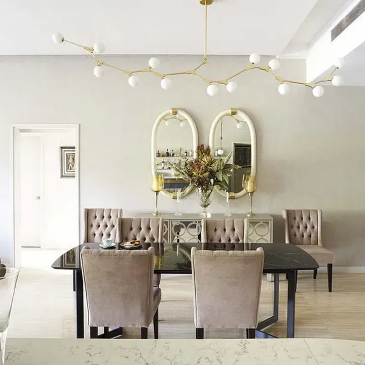 Stepping into this family home feels like arriving at a bona fide hospitality establishment. It has a grand entrance. Guests are welcomed into a sizeable foyer decorated with a round mirror with a marble shelf.