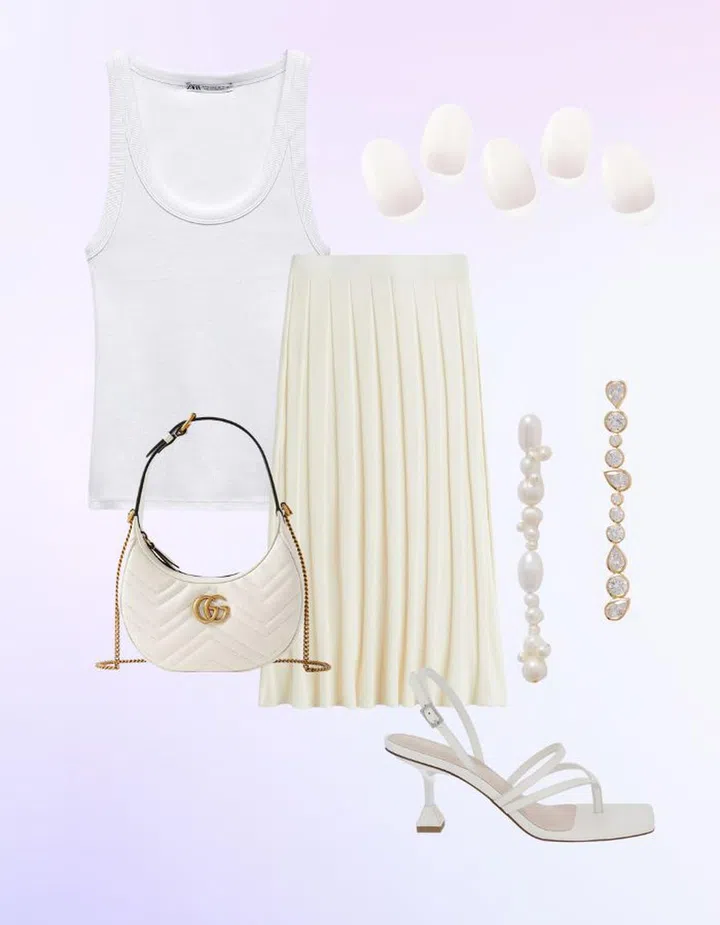 The thing about all white is that you can always layer different shades of white to create more visual depth. Think smoky white meets optic white meets off-white! A bit of sparkle and glimmer goes a long way, which is why we’ve opted to finish the look with gold hardware and statement earrings too.