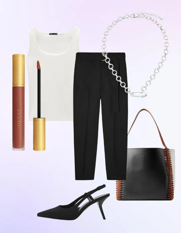 Recreate the Bottega Veneta look by starting with a pair of classic black pants. We love these high waisted pants, as they are more flattering, and we opted to keep the look office appropriate with sensible pumps, a roomy tote and a mauve-coloured lipstick.