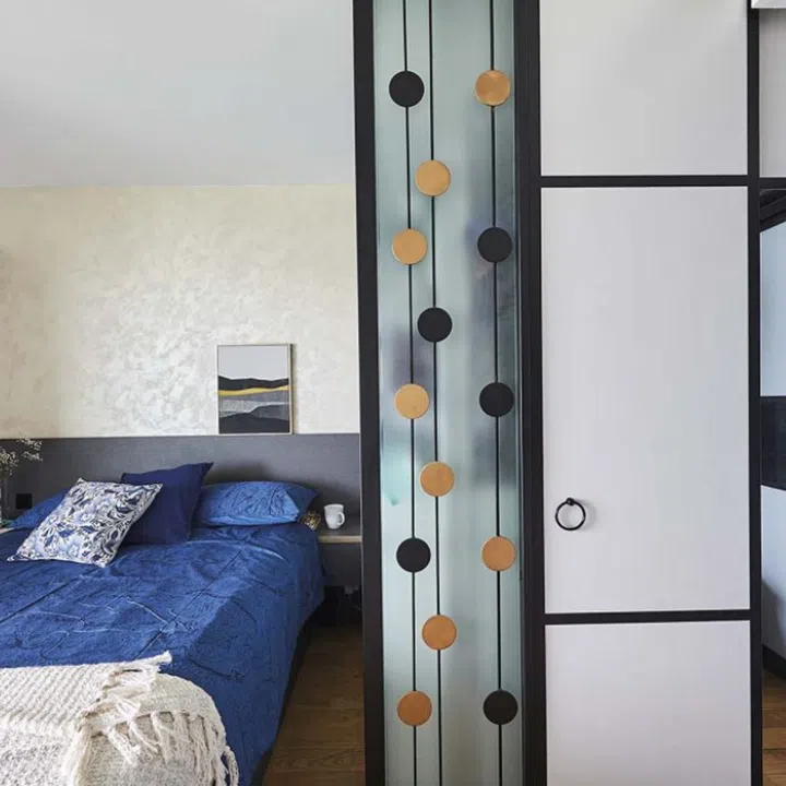 A full-height wardrobe can partition your room into sleeping quarters and walk-in wardrobe area. Use light colours and strategic lighting to ensure the room doesn’t feel small or closed off. Where possible, incorporate sections where the light can shine through.