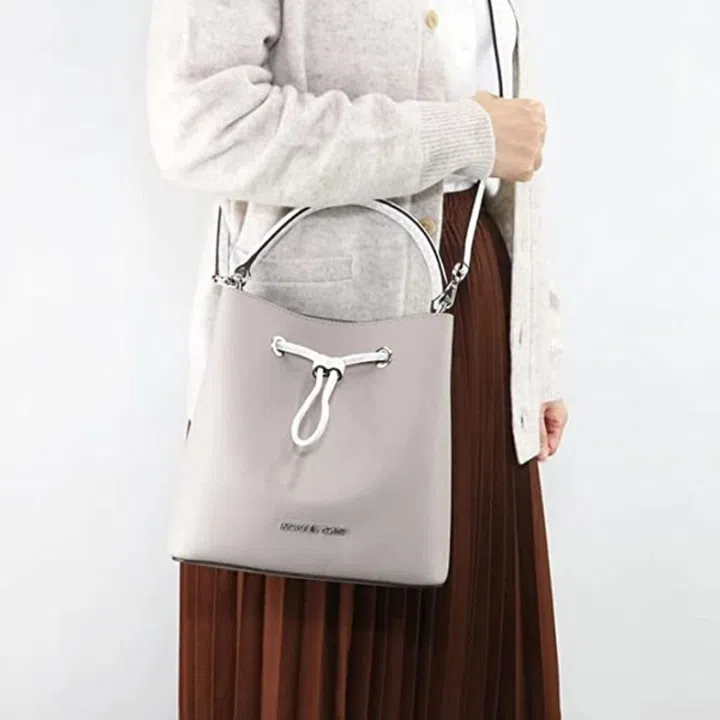 The soft grey of this leather bucket bag works well with most outfits, while the spacious interior easily holds daily essentials. The shoulder strap is also detachable so you can carry the bag by its handle for a different look. Also available in black.
