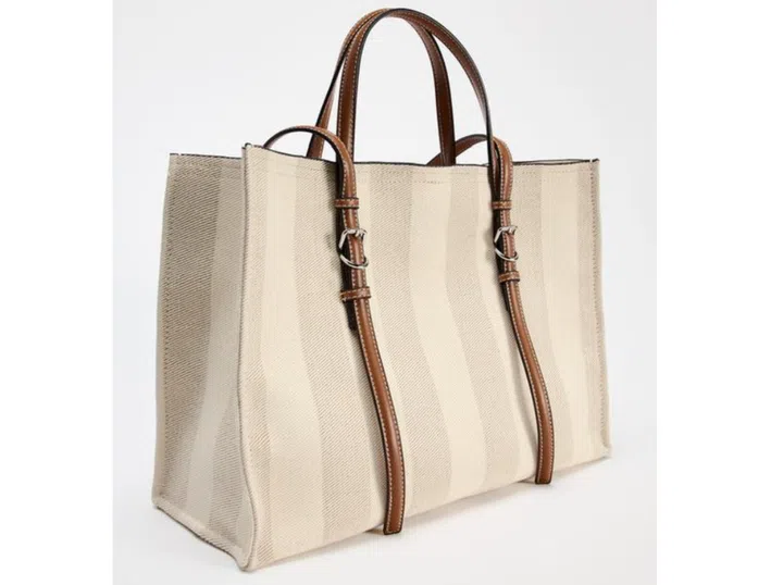 A spacious handbag gives you the freedom to carry everything you need on the go. This striped canvas tote with contrasting leather straps is perfect for both a getaway and the office, effortlessly fitting all your essentials, including a small laptop.