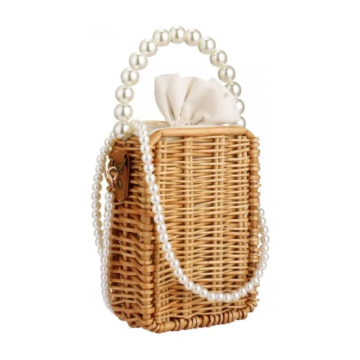 Also available in a circular silhouette, the retro-inspired bag has a unique design combining woven straw and pearl chain. It can be worn as a handbag or crossbody and can fit your phone, a cardholder and red packets.