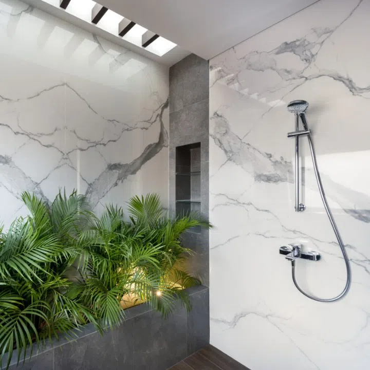 On the uppermost level, a skylight and planter with lush greenery make showering a semi-outdoor experience.