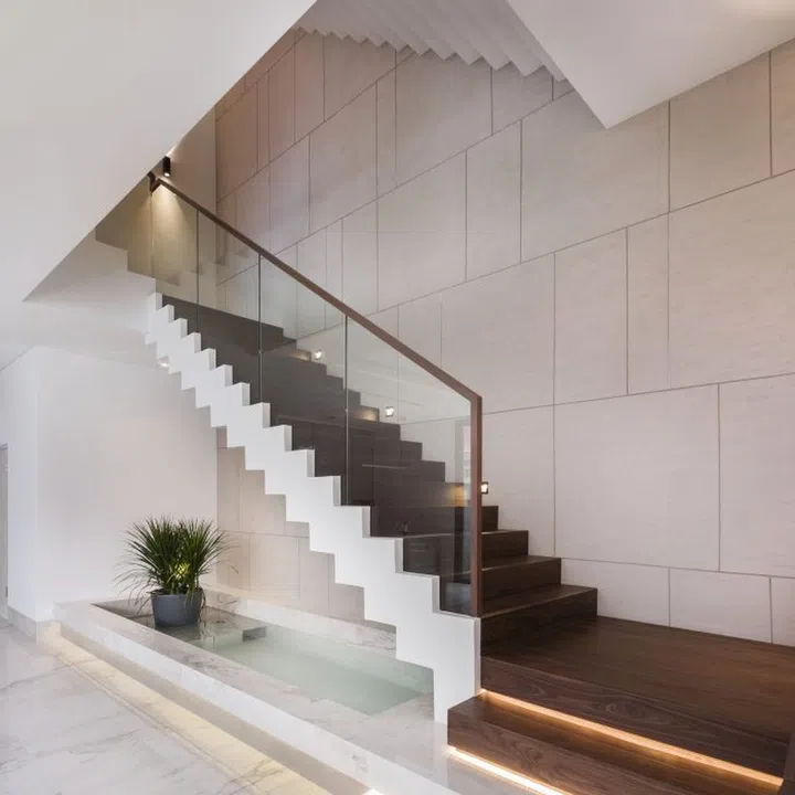 One of the focal points of the home is the staircase, which features accent lighting, integrated seating and a water feature.