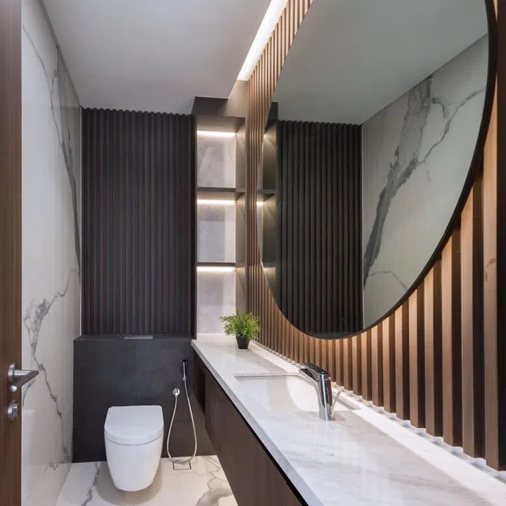 In the powder room, timber accents and marble-look tiles form the backdrop for a large mirror, lending a sense of minimalist luxe.