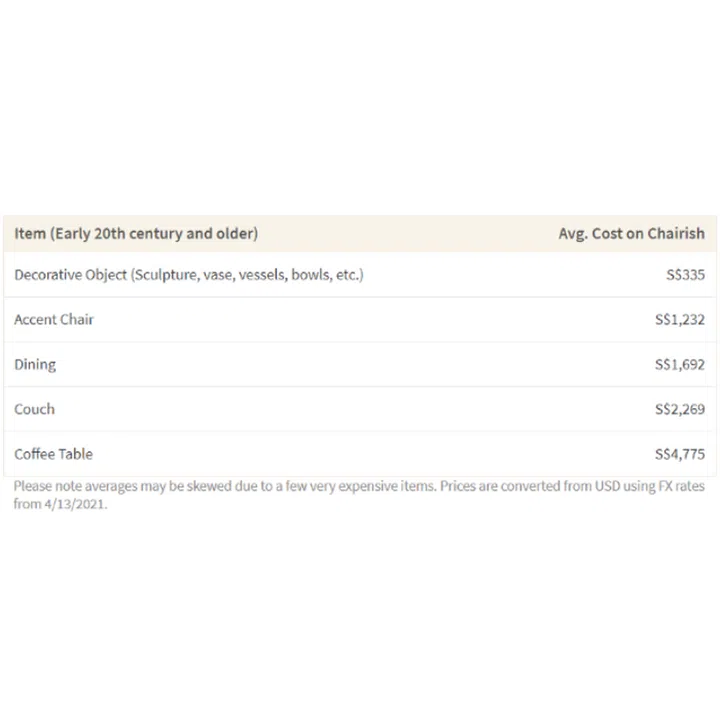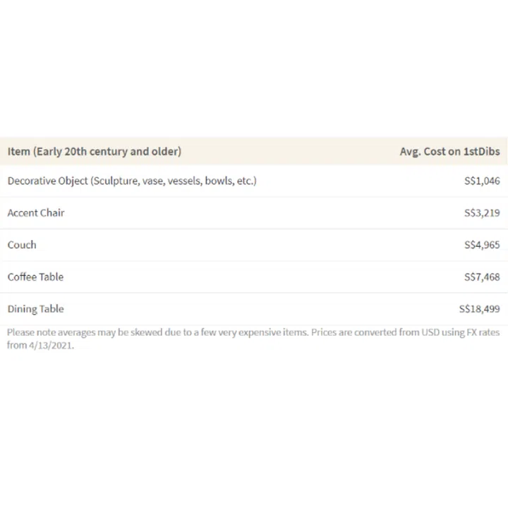 If you have an unlimited budget or have saved up funds for an heirloom piece, then 1stDibs, Journey East and auction houses like Sothebys or Christies can be great options for high-end, well-preserved furniture and decor. 1stDibs is one of the oldest online marketplace for vintage and antique housewares and they have sellers from all over the world, so you'll be hard pressed to find a better selection elsewhere. Prices are mainly on the higher end, with some items costing under S$100, but most costing over a thousand, and others ranging into the tens of thousands of dollars.