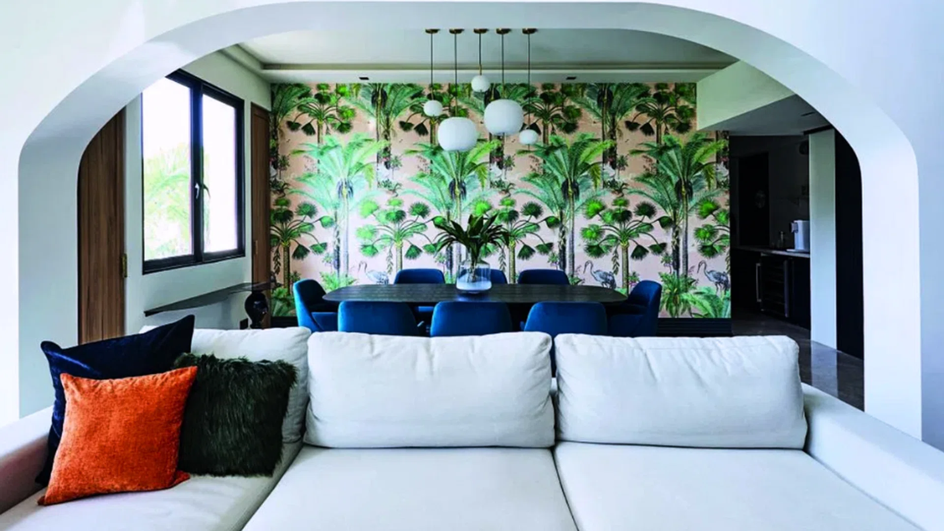 The interior design concept was built around the vivid tropical-themed wallpaper