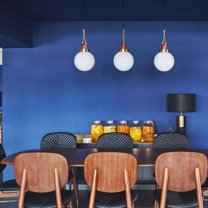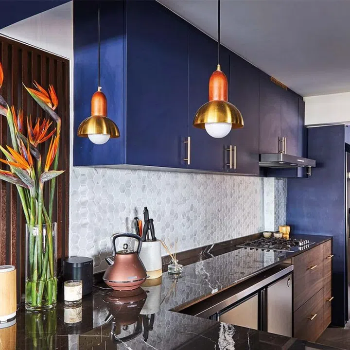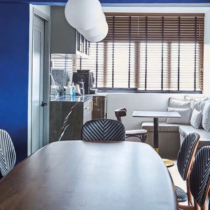 With the living room distinguished by the herringbone floor tiles, Liang Wei used colour to spatially define the dining area. “It was partly because I did not want to have too many different flooring treatments,” he explains. The wall and ceiling are a shade of deep blue similar to the laminate on the kitchen cabinets. This creates a cosy, well-defined space that ties the dining and kitchen spaces together.