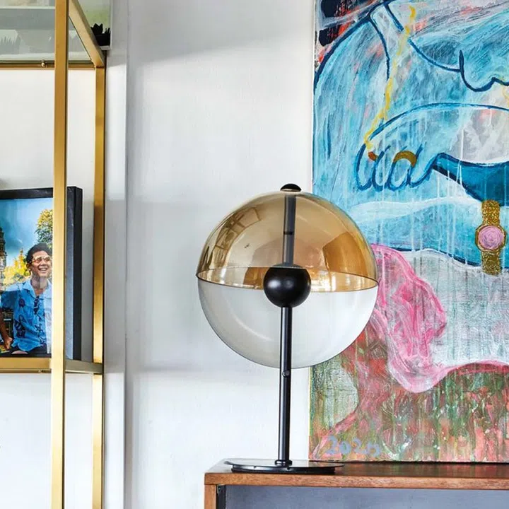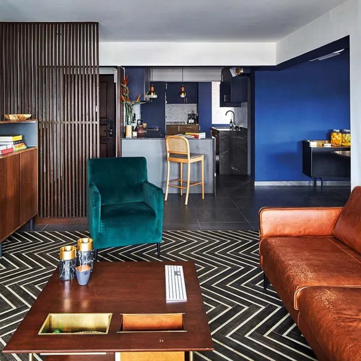 Floor tiles laid in a herringbone pattern welcome visitors into the home. The same pattern defines the living area while the darker-coloured palette meets with Chen Seong’s preference. The brass accents are a cool counterpoint to the warm tones.