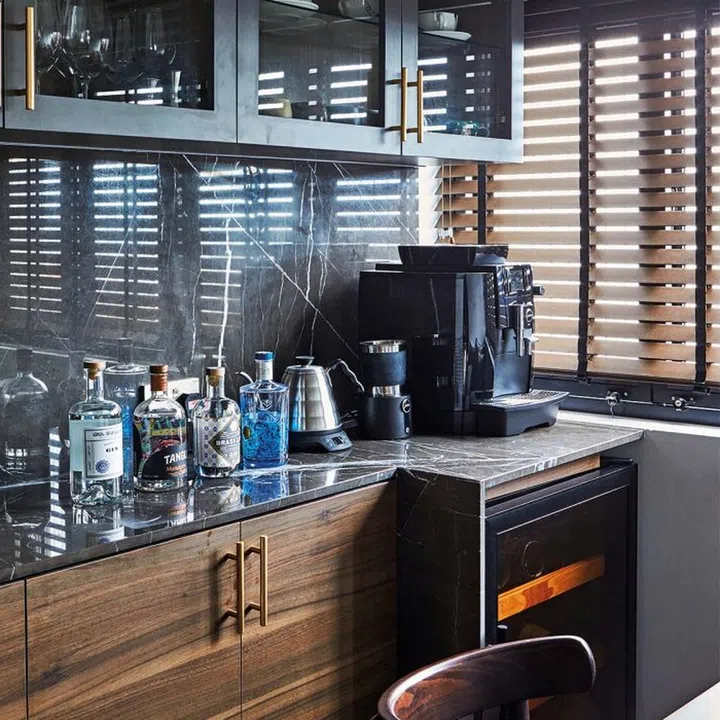In-between the two remaining bedrooms is an inviting breakfast nook with a well-stocked bar. As it is right beside a window, the diffused light that filters in through the blinds casts a soft glow that imbues the space with a relaxed and welcoming ambience.