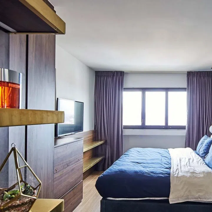 On the opposite side is the master bedroom. It has an understated design with a controlled palette of different wood tones and various shades of grey juxtaposed with brass elements.