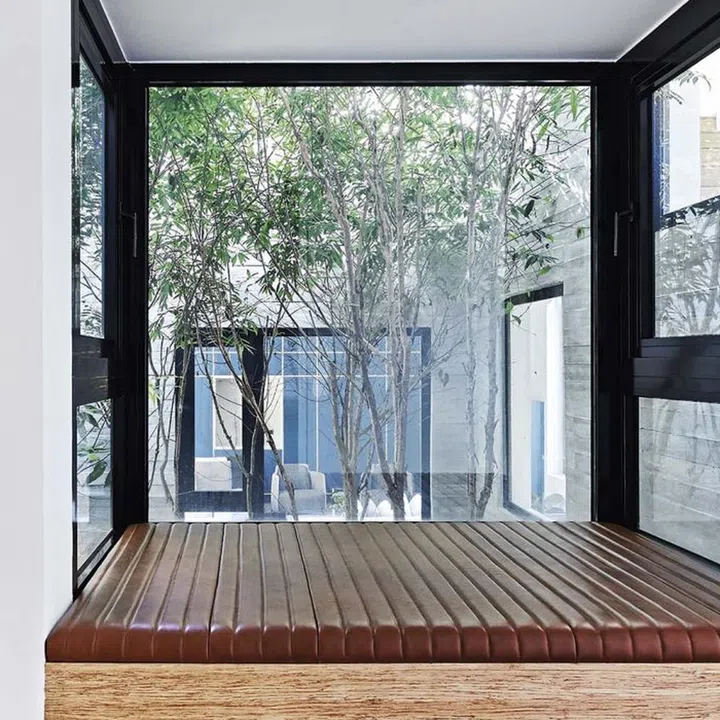 This cosy bay window outside the daughter’s bedroom, for instance, extends into the courtyard.