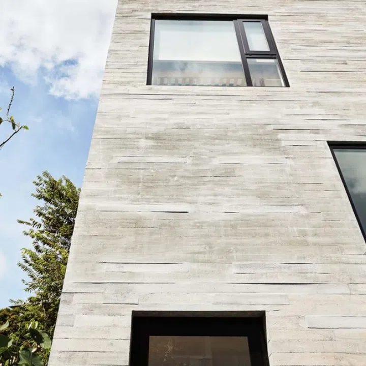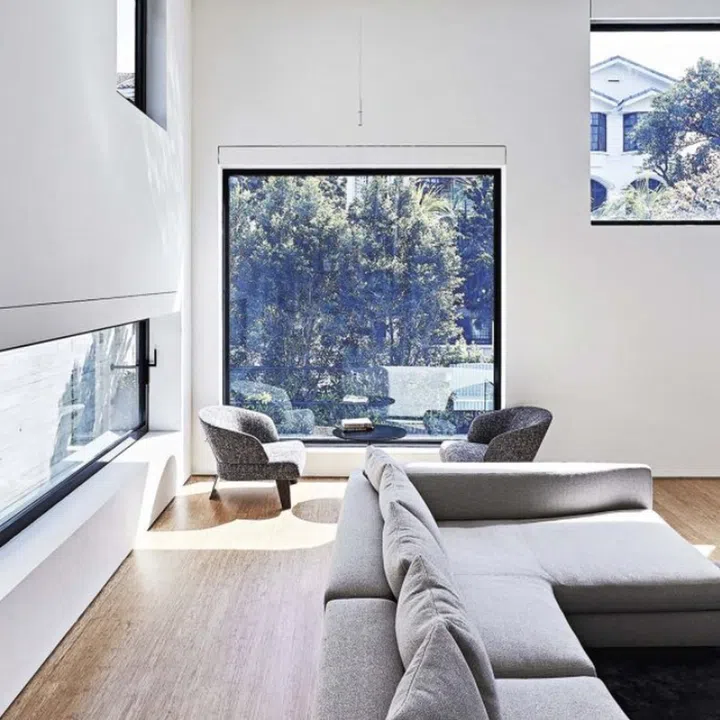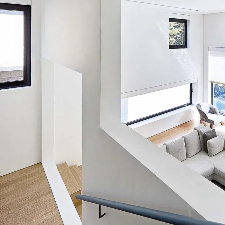 The spaces flow and unfold across multiple split levels in-between these two shells, creating a dialogue with the openings strategically punctured into the shells.