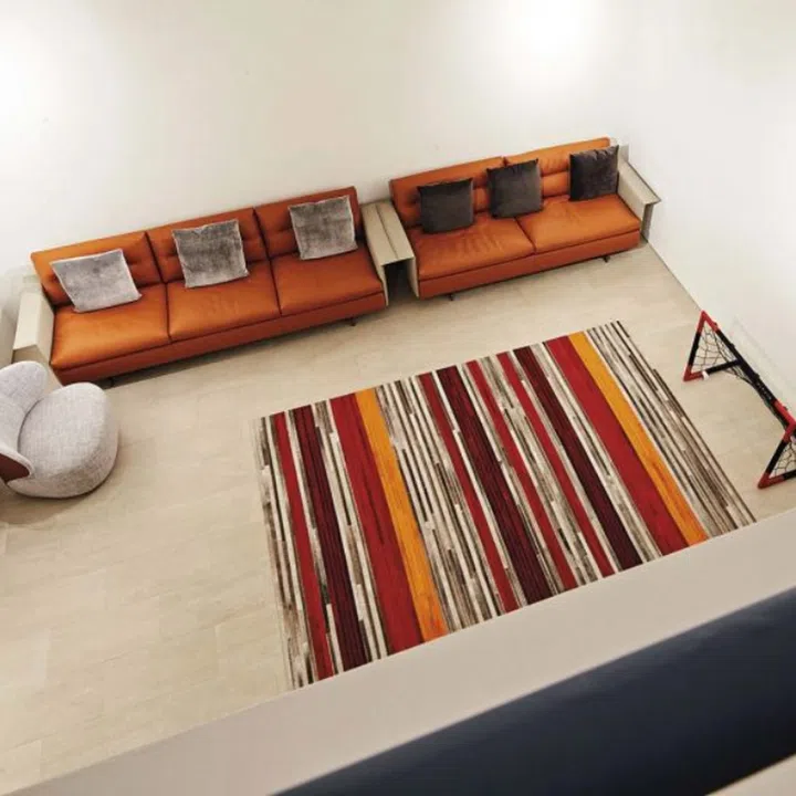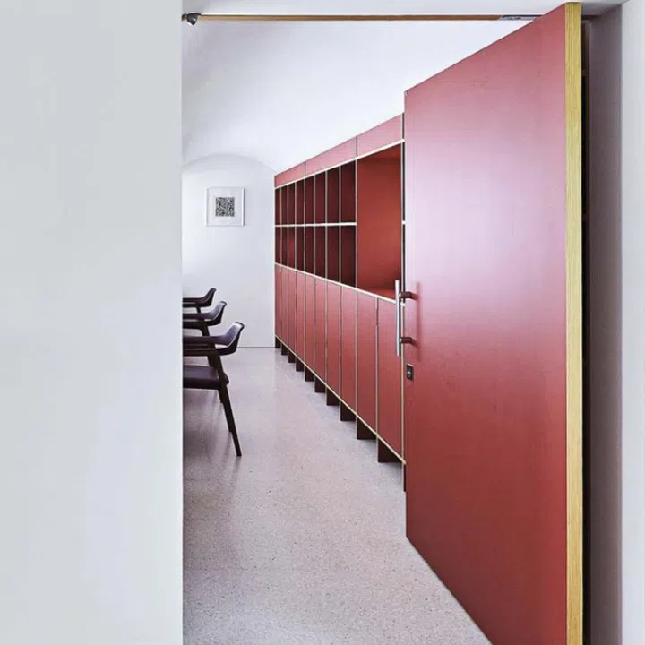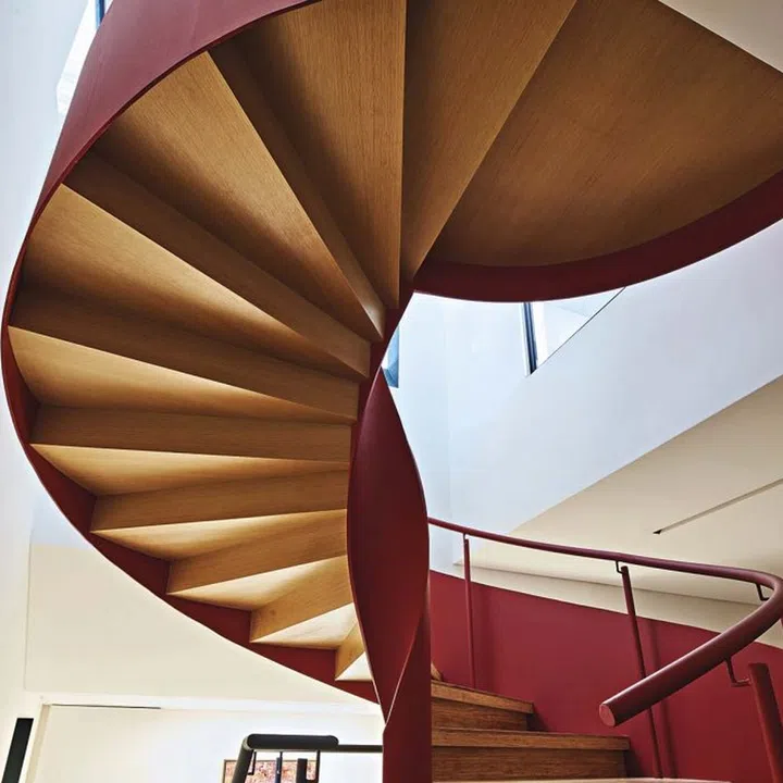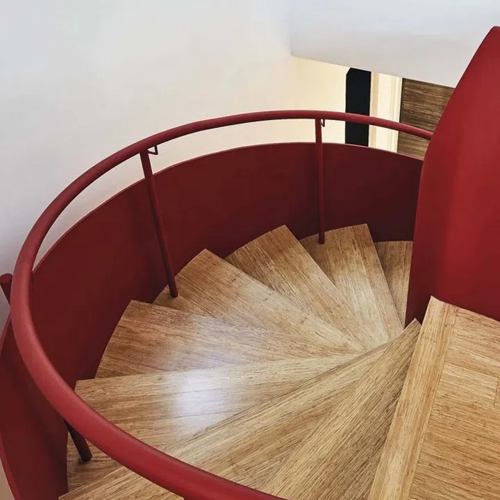 In creating maze-like spaces, colours in strategic places serve as visual markers, like this red spiral staircase.