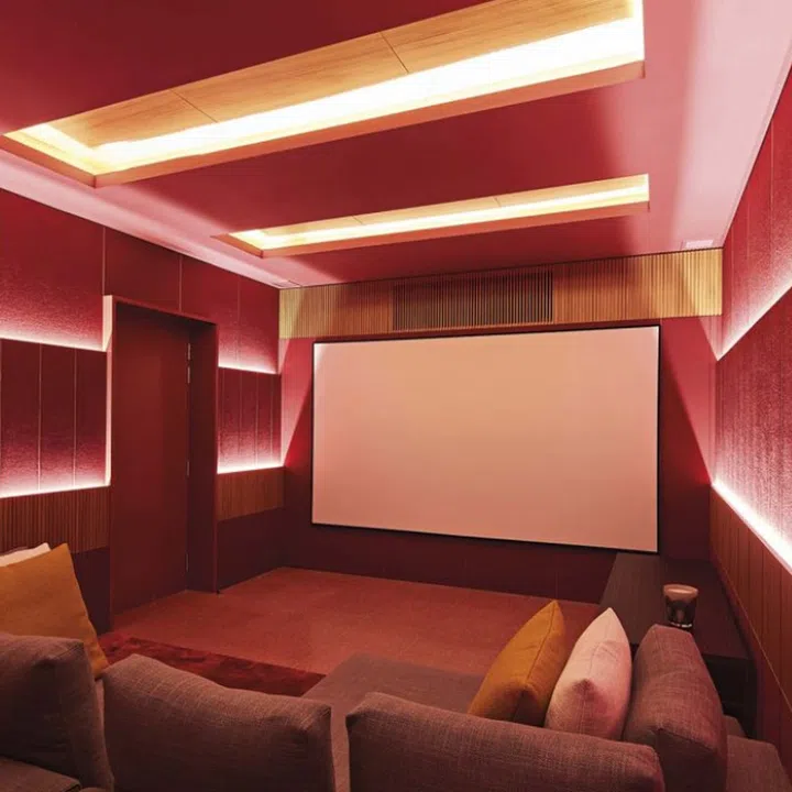 From here, a straight flight of stairs leads further down into the basement, where there’s an acoustically sound entertainment room and a multipurpose chill-out zone. A few steps up from the basement foyer, a music area overlooks the space below.