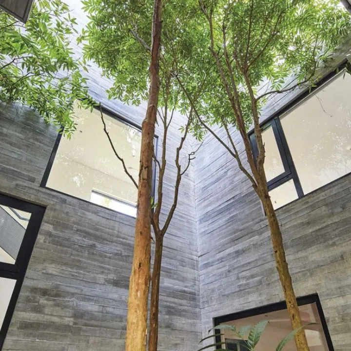 An outer shell frames the outdoors and an inner one wraps around a garden courtyard that extends to the full height of the house.