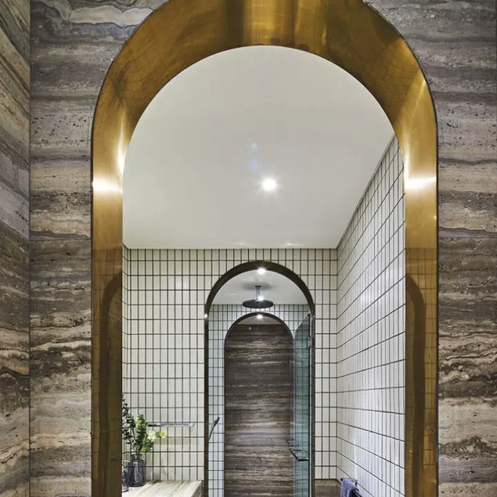 The arches and marble finishes in the master bathroom evoke a Roman bath ambience.