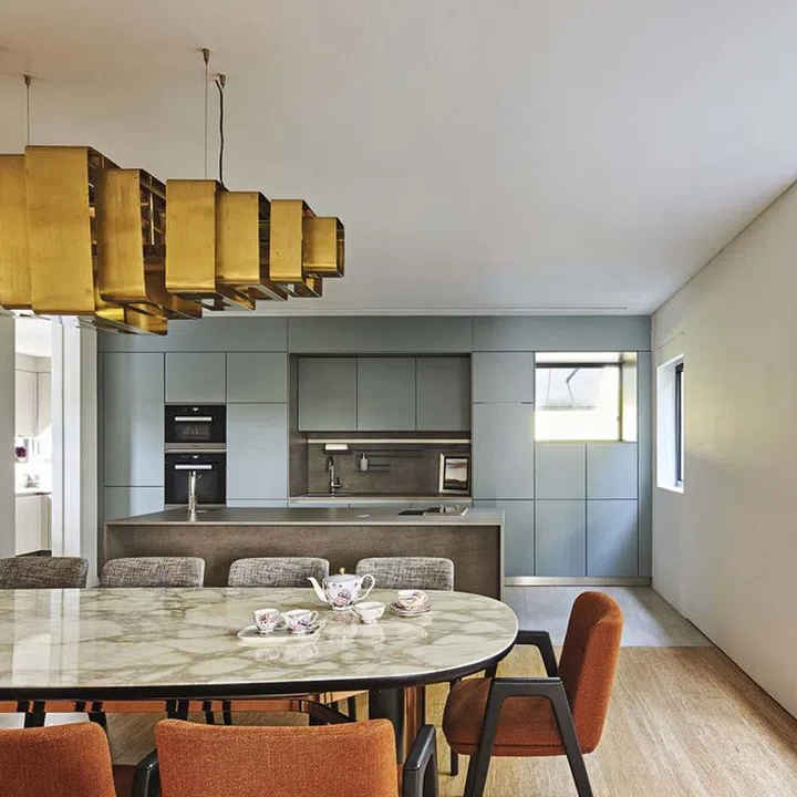The recurring rectilinear motifs in the dining area and dry kitchen echo the geometry of the windows.