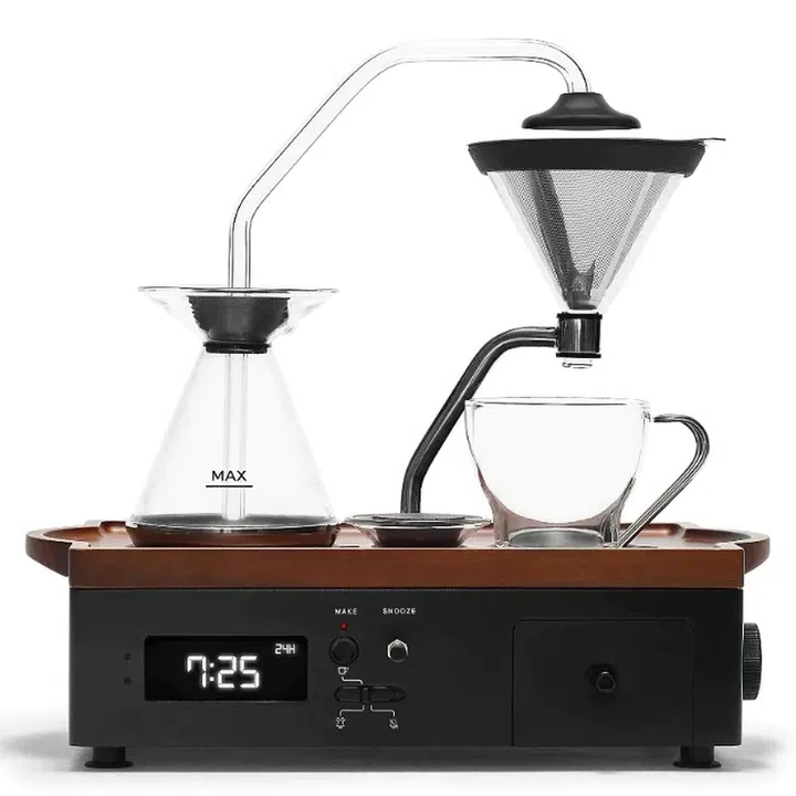 Another item for coffee connoisseurs in the home office – except this time, you’ll literally be waking up to the aroma of freshly brewed pour-over, served on a walnut tray out of high-quality borosilicate glassware. The alarm clock has a compartment for keeping your milk chilled overnight. A little extra? Maybe, but who’s complaining?