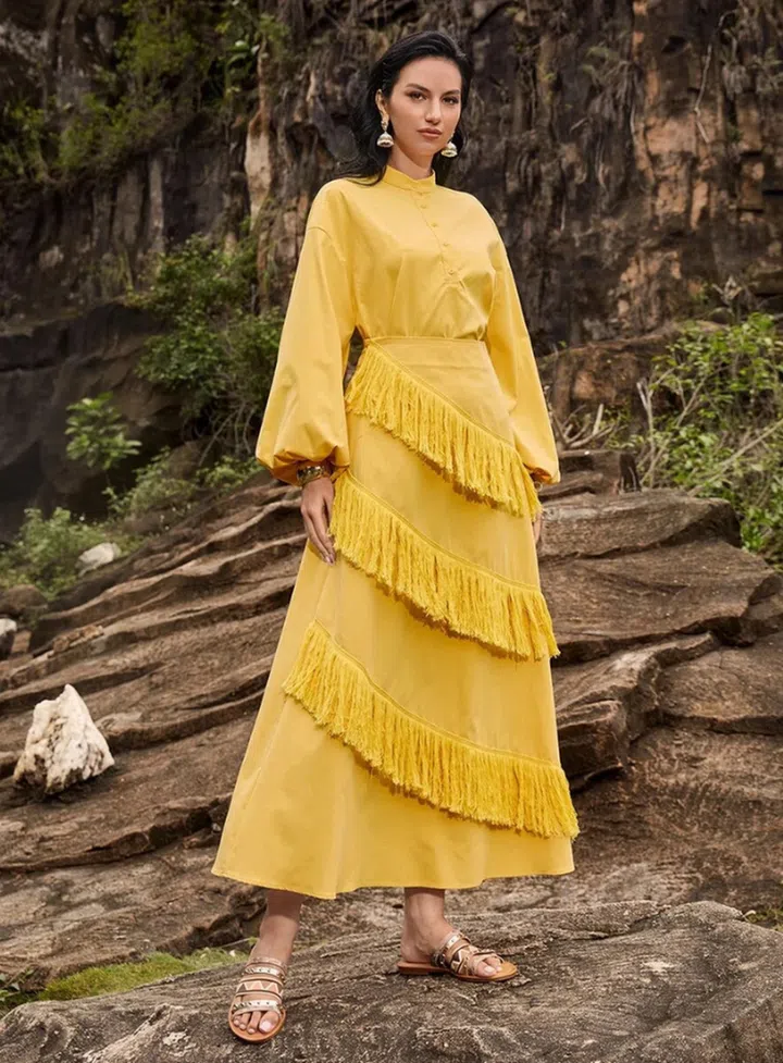 You just realised you have a dinner appointment tonight in town, and you need to glam up in under 60 seconds. That’s when you reach out for this mustard-coloured co-ord look by Shein. Featuring dramatic puffy sleeves and fringe trims cascading down a midi-length skirt, you only need to throw on a pair of stilettos and you are all set!