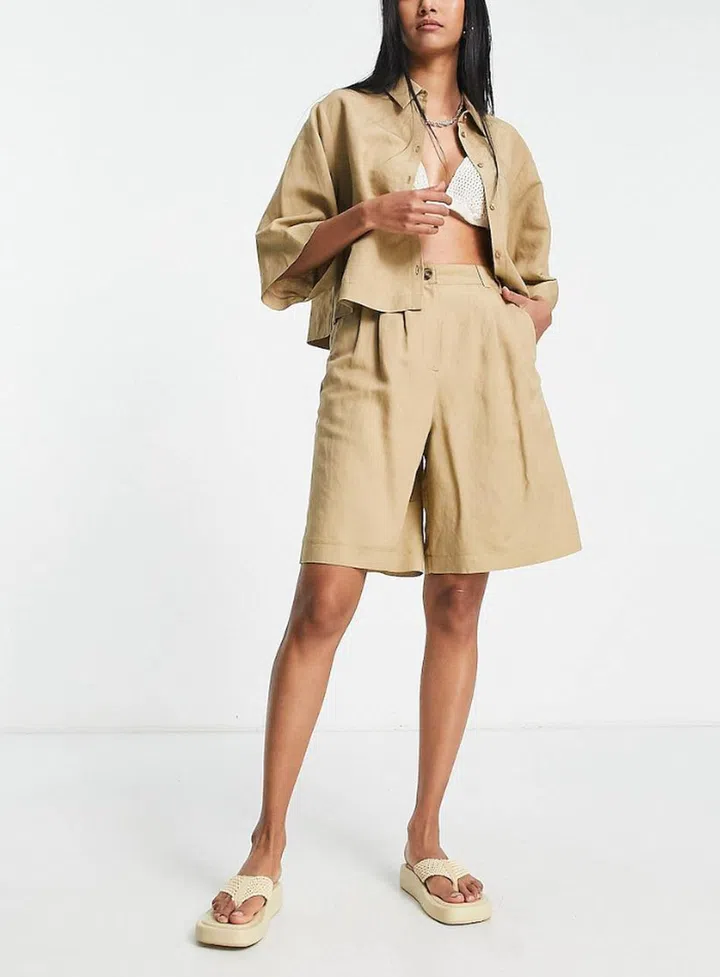 Borrow from the boys with a utilitarian shirt-and-pants twinset. The linen-blend material is a great heat-buster, and you can wear this a million ways! Team with strappy black stilettos for that It girl-inspired look that’s trending on social media, or dress down in white sneakers and a weekend bag.