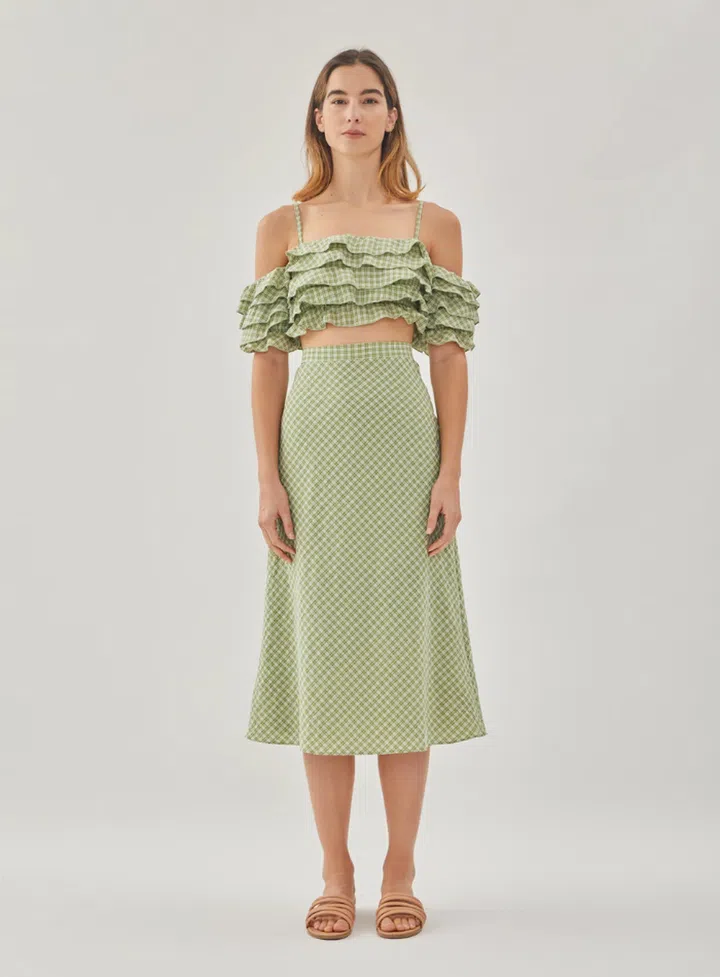 Beat the heat with an easy skirt teamed with a matching ruffled crop top. The muted shade of pistachio green with micro-checks calls to mind the cottagecore trend, yet it’s still elegant enough that you won’t ever look like you’re trying too hard. All that’s left is to slip into summer sandals and grab your basket bag before you leave the house.
