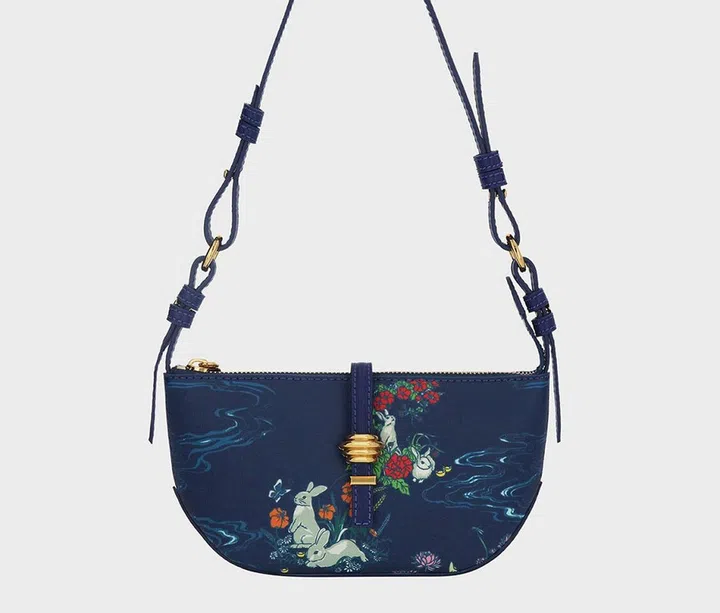 Taking inspiration from traditional Chinese-style paintings, consider this shoulder bag a work of art. Vibrant illustrations of rabbits, florals, and flowing water stand out against the sophisticated navy blue finish.