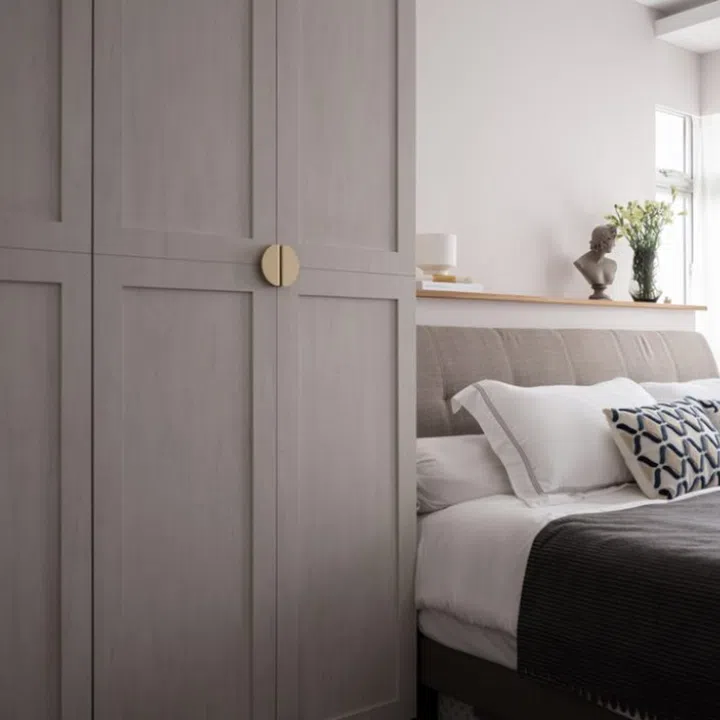 The master bedroom includes more grey for a restful look. Accessories, like the flowers and cushions, add colour and visual interest.
