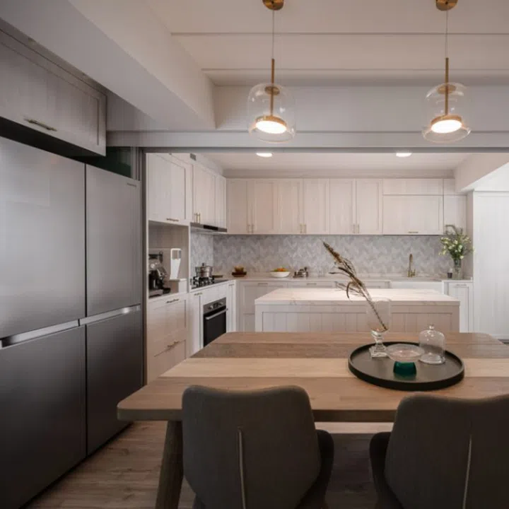 The open-concept kitchen looks extra spacious, thanks to the use of a mirror, an extra-large refrigerator, and an island counter. These play with visual scale, making the kitchen feel much bigger and more well-integrated into the rest of the space.
