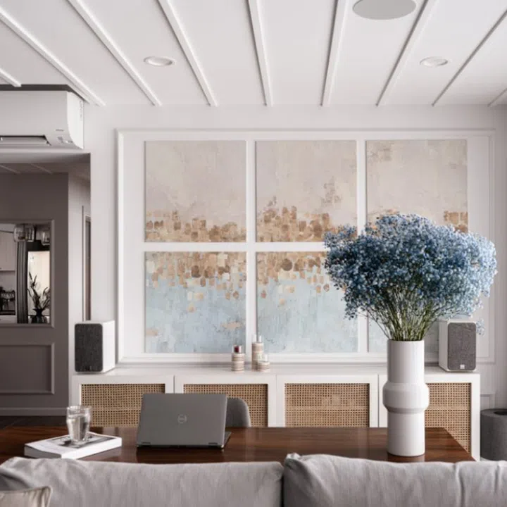 The table behind the sofa pulls double duty as a home office for checking emails. To add texture, the design team used rattan for the cabinet doors and abstract artwork in similar earthy and pastel shades.